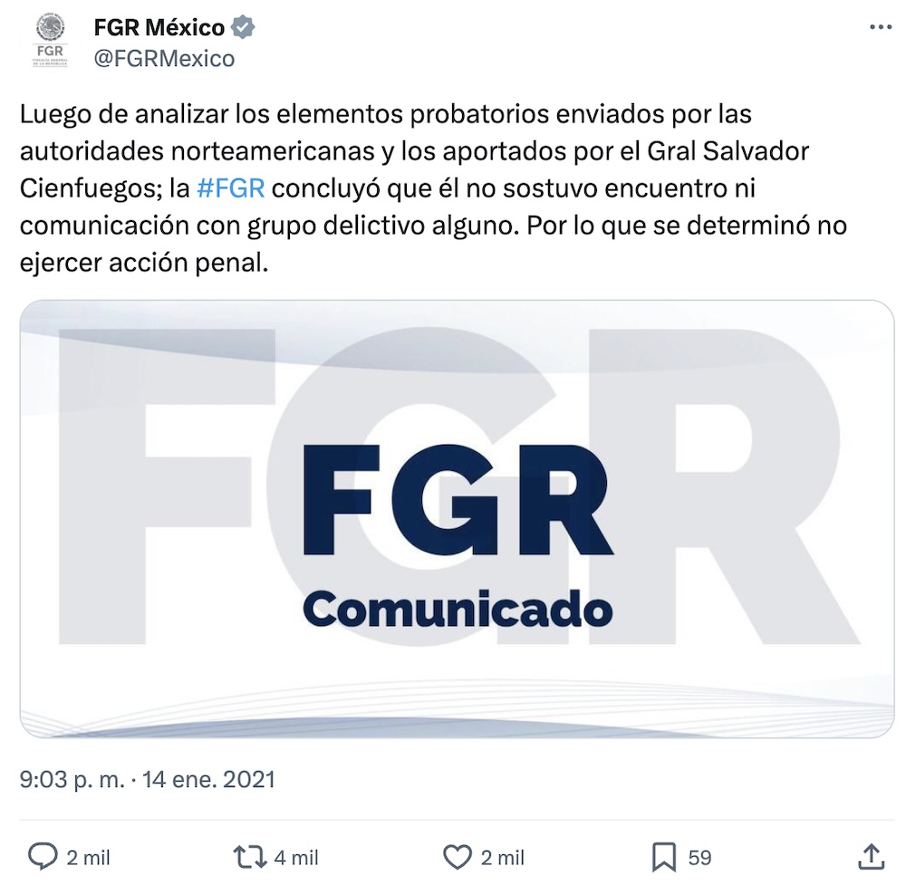 Más tarde, la FGR dijo que no acusaría a Salvador Cienfuegos porque, después de una investigación exprés, determinó que no tuvo comunicación con ningún grupo criminal.
