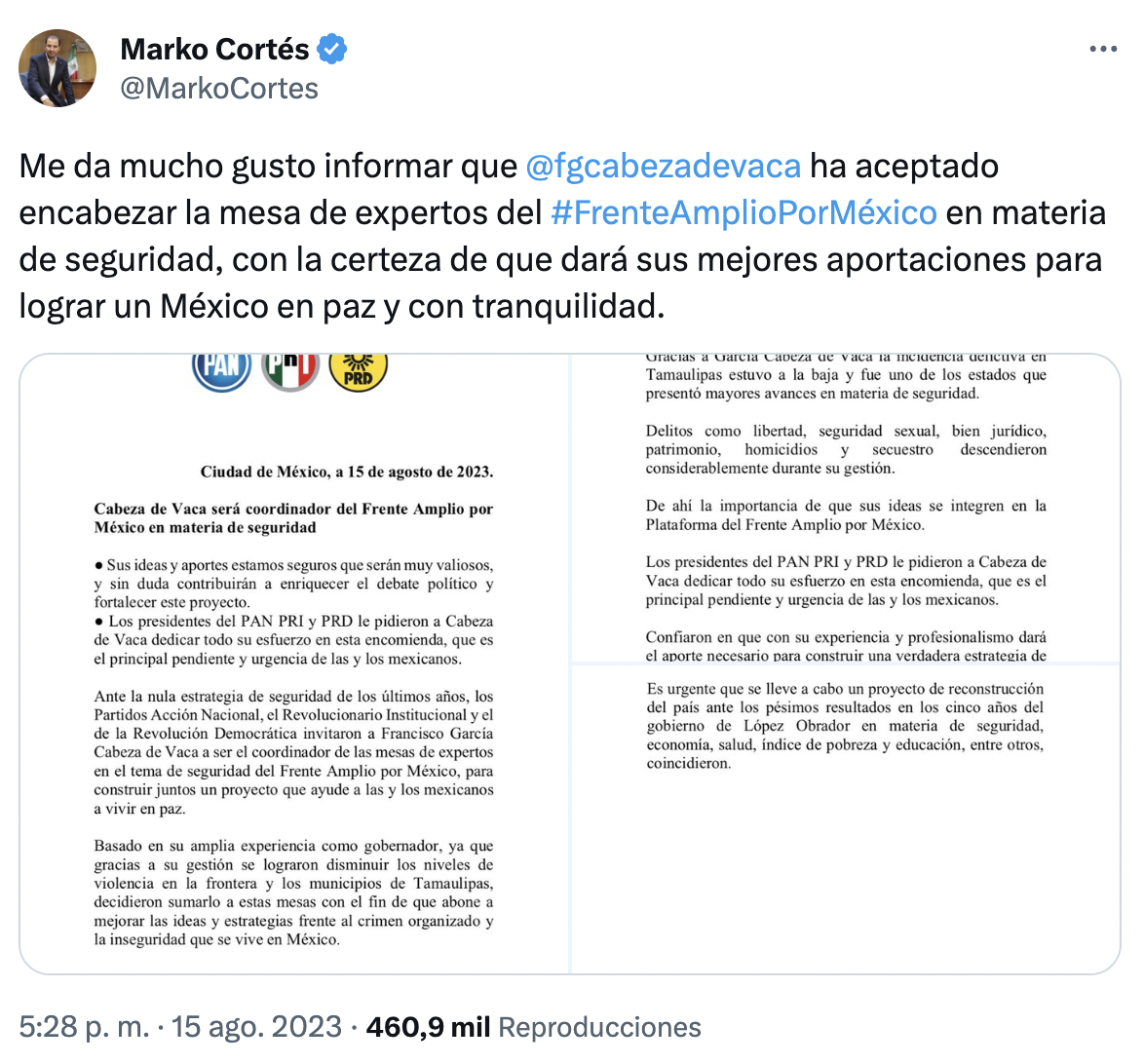 Nombre, son unos genios. Por medio de un comunicado, el Frente Amplio por México anunció que designaron al exgobernador de Tamaulipas, Francisco García Cabeza de Vaca, como coordinador de las mesas de expertos en el tema de seguridad.