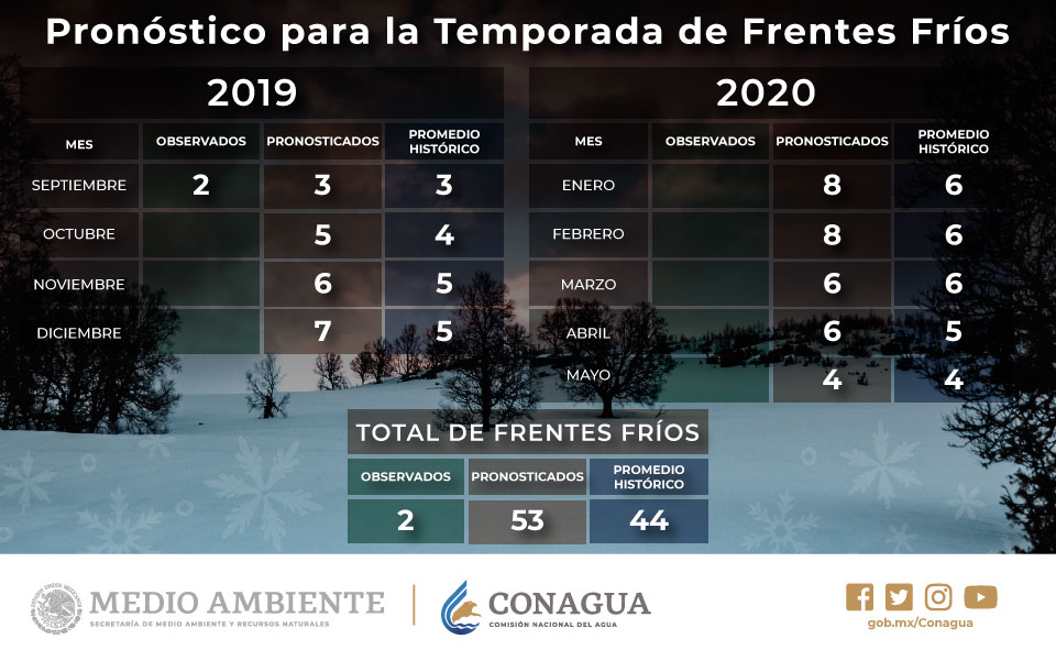 El SMN, de acuerdo con registros anteriores y pronósticos basados en las condiciones atmosféricas, anunció que para la temporada 2019-2020 se esperan nada más y nada menos que 53 frentes fríos.