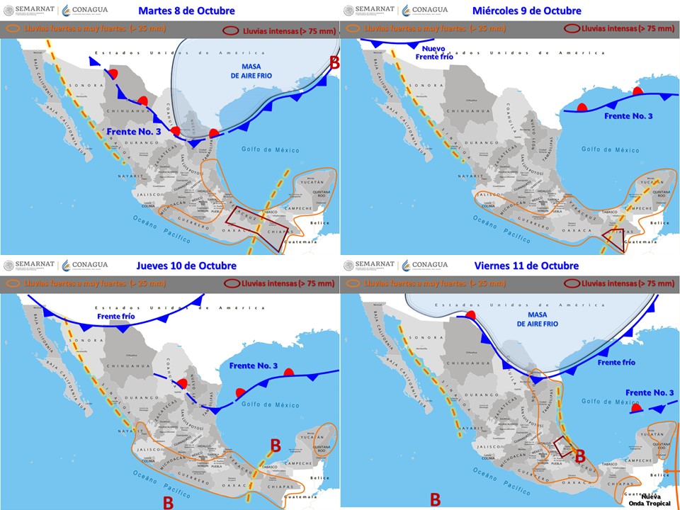 Debido a que tendrá una interacción con un canal de baja presión que se encuentra extendido sobre el suroeste del Golfo de México, estará provocando lluvias fuertes acompañadas de descargas eléctricas y posibles caídas de granizo para regiones de Puebla, Veracruz, Oaxaca, Chiapas y la Península de Yucatán.