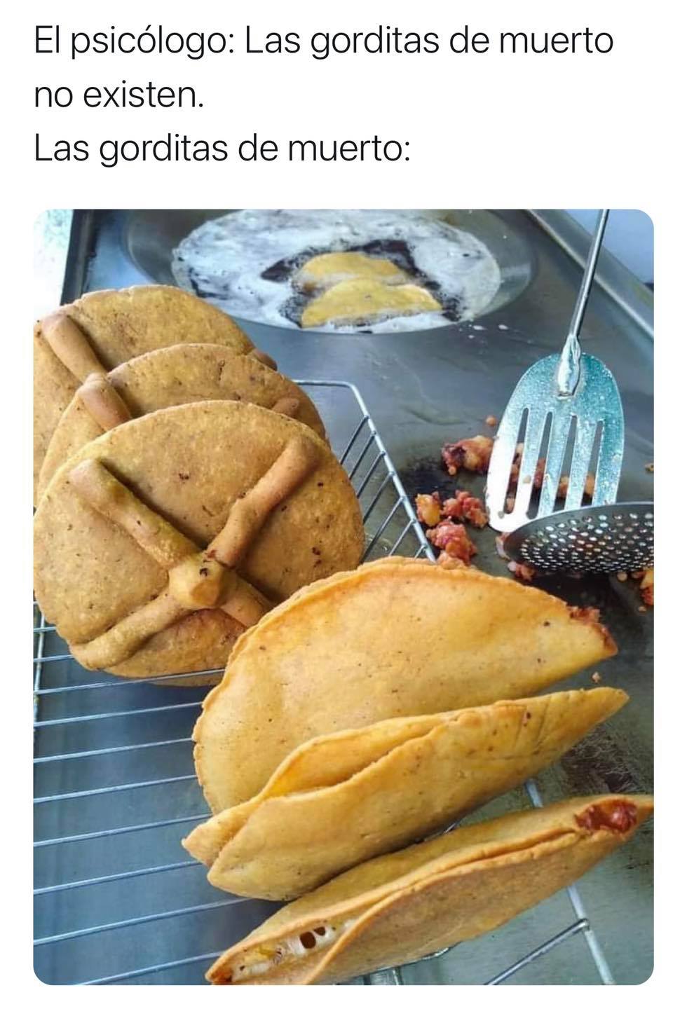 La gordimuerta es una gordita de chicharrón que tiene forma de pan de muerto: con sus huesitos y toda la cosa.