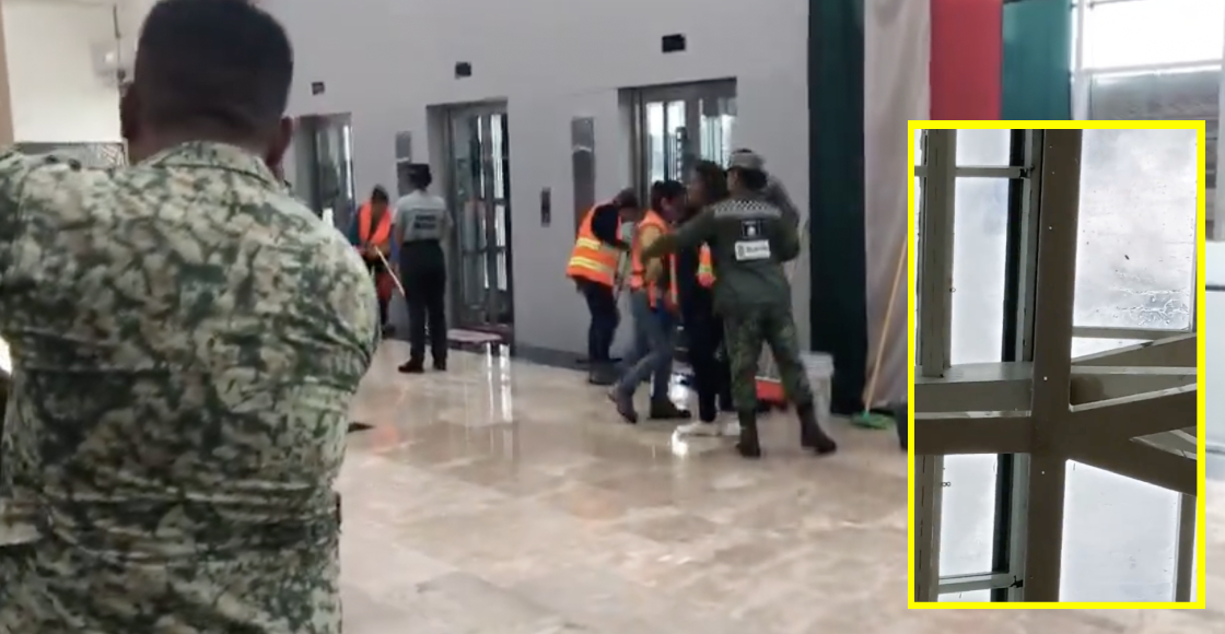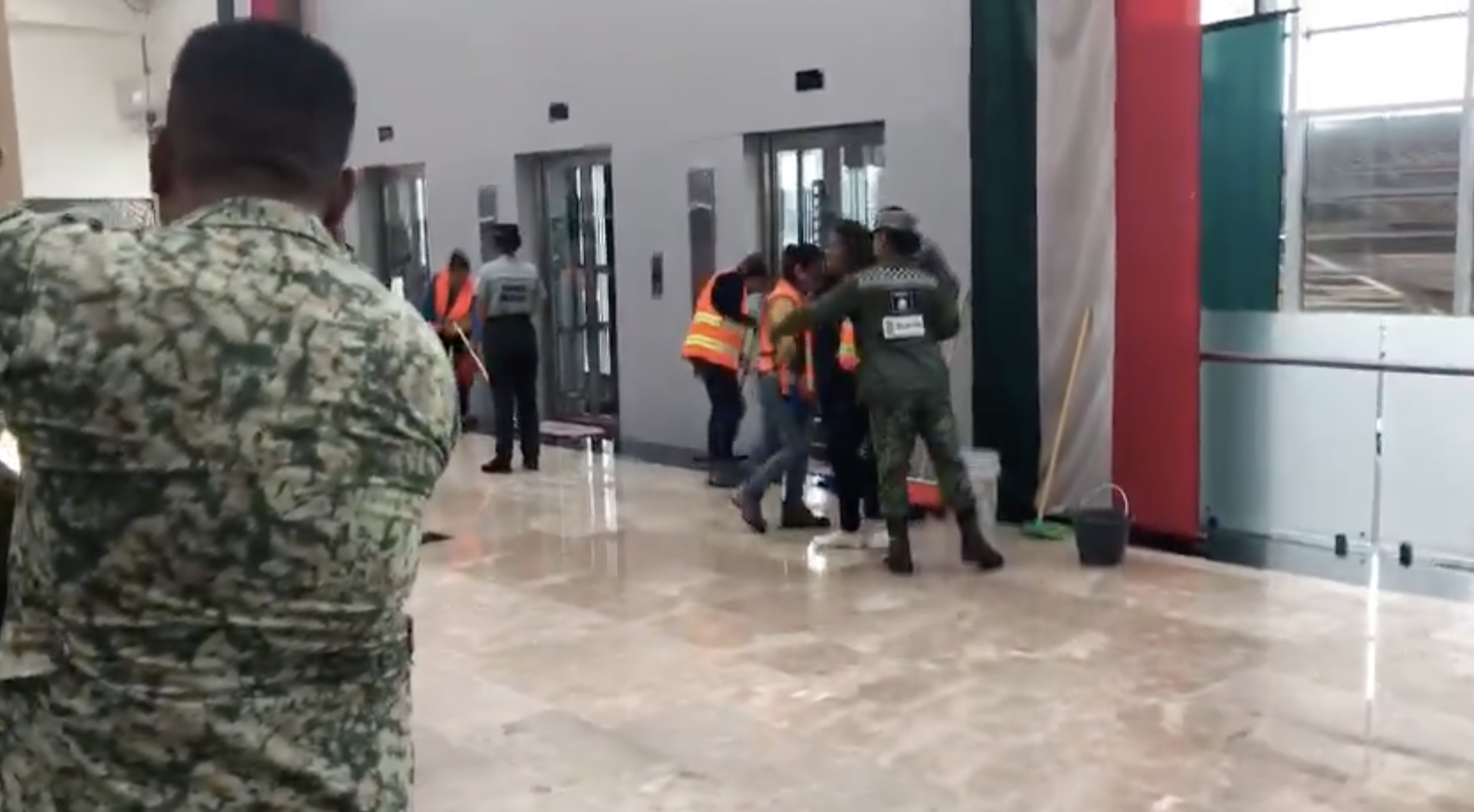 Pues resulta que por la lluvia el agua comenzó a filtrarse desde el domo del aeropuerto y los militares tuvieron que sacar los trapeadores para limpiar el piso.