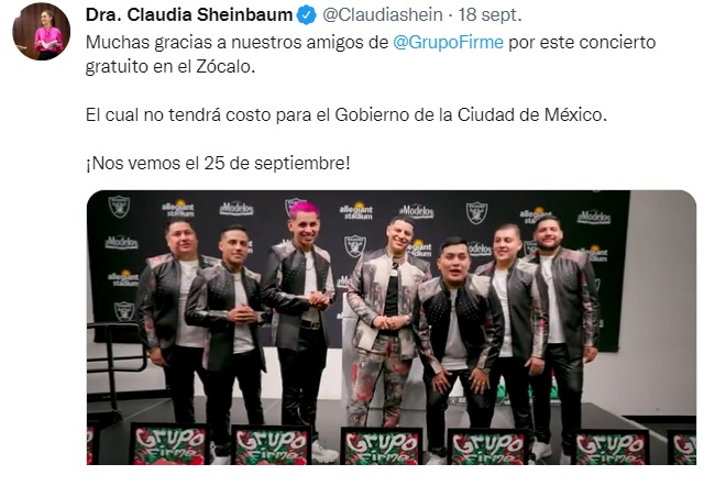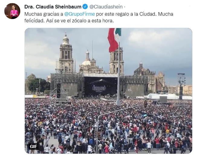 “Grupo Firme rompe récord de asistencia a cualquier concierto en el Zócalo de la Ciudad de México. Se estiman 280 mil personas”, señaló Sheinbaum en su cuenta Twitter, en un mensaje acompañado con un video de una pareja haciendo espectaculares malabares al ritmo de la banda.