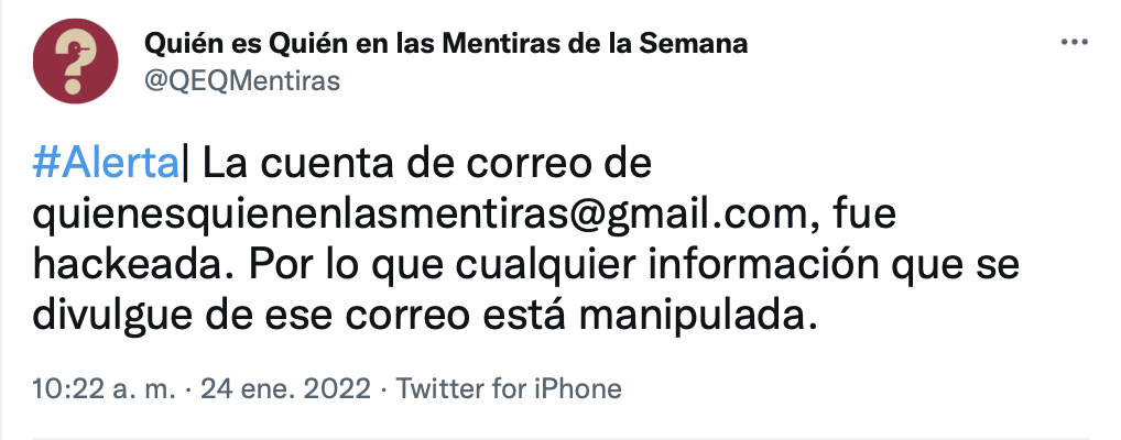 “La cuenta de correo de quienesquienenlasmentiras@gmail.com, fue hackeada”, escribieron el lunes en su cuenta de Twitter, a modo de alerta para sus 10 mil seguidores. “Por lo que cualquier información que se divulgue de ese correo está manipulada”.