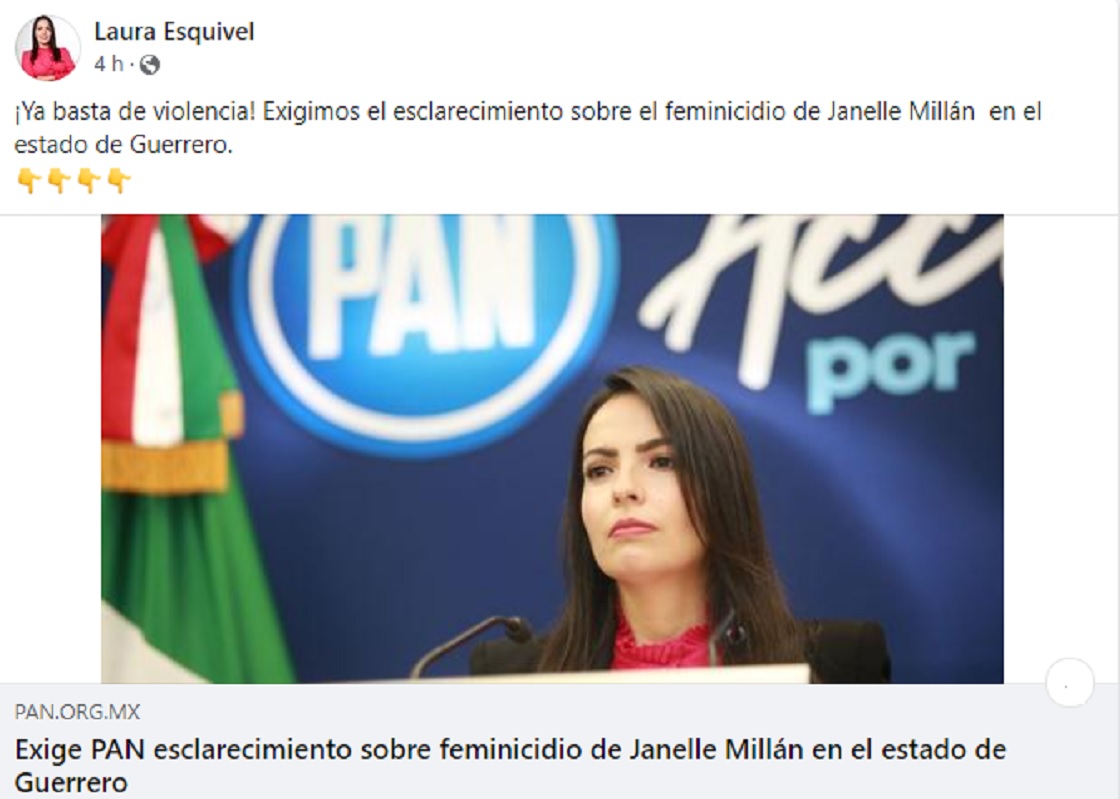 Tras confirmarse la muerte de Janelle Millán, el PAN nacional exigió a las autoridades dar con los responsables de lo que probablemente será investigado como feminicidio. “La violencia contra las mujeres deben parar inmediatamente”, señaló Acción Nacional en mensaje difundido por medio de su cuenta Twitter.