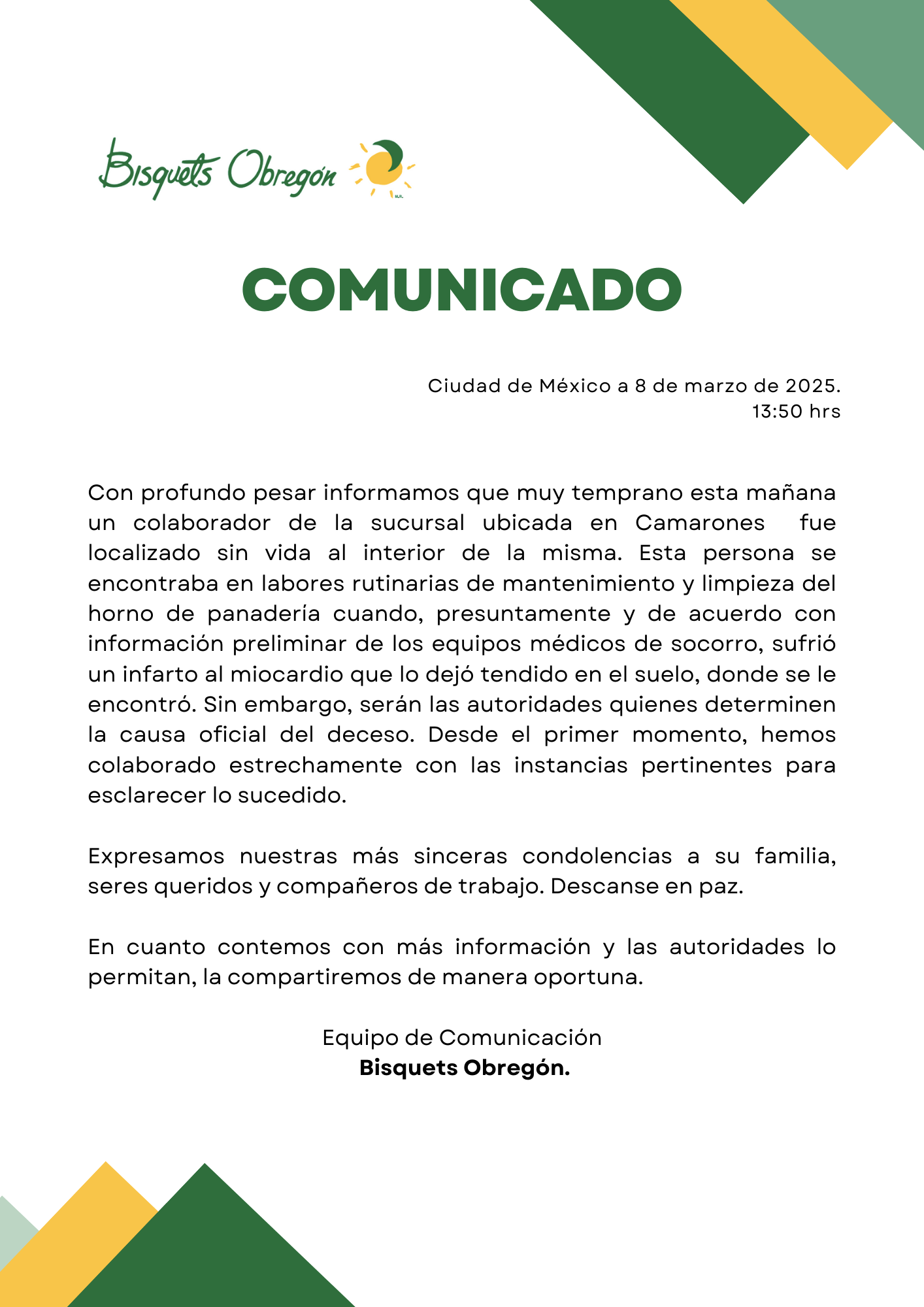 La cadena compartió un comunicado informando que se trataba del empleado de mantenimiento, quien realizaba limpieza en un horno de pan cuando sufrió un paro al miocardio, según sus equipos médicos.