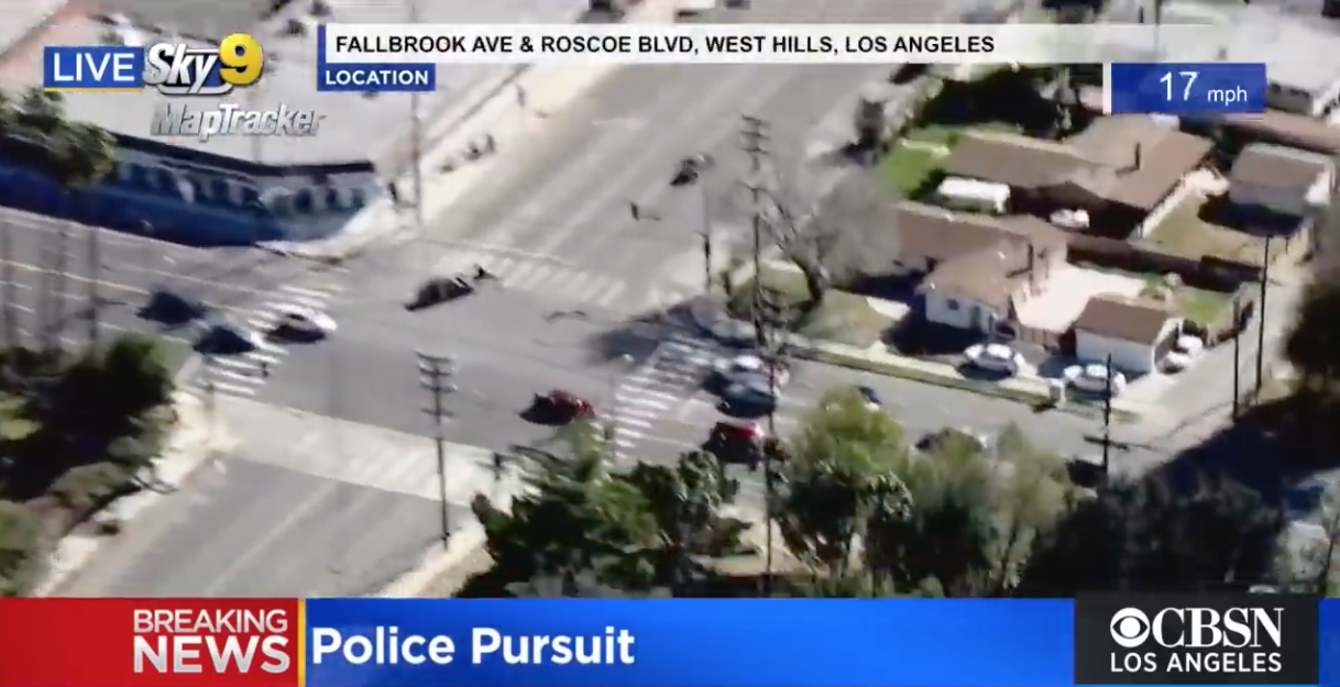 Un helicóptero del Departamento de Policía de Los Ángeles comenzó a seguir al motociclista en los aires para no perderle el rastro mientras los policías alcanzaban al sospechoso en tierra. Al mismo tiempo, un canal de televisión transmitía la persecución en vivo y en directo a quienes veían las noticias en ese momento.