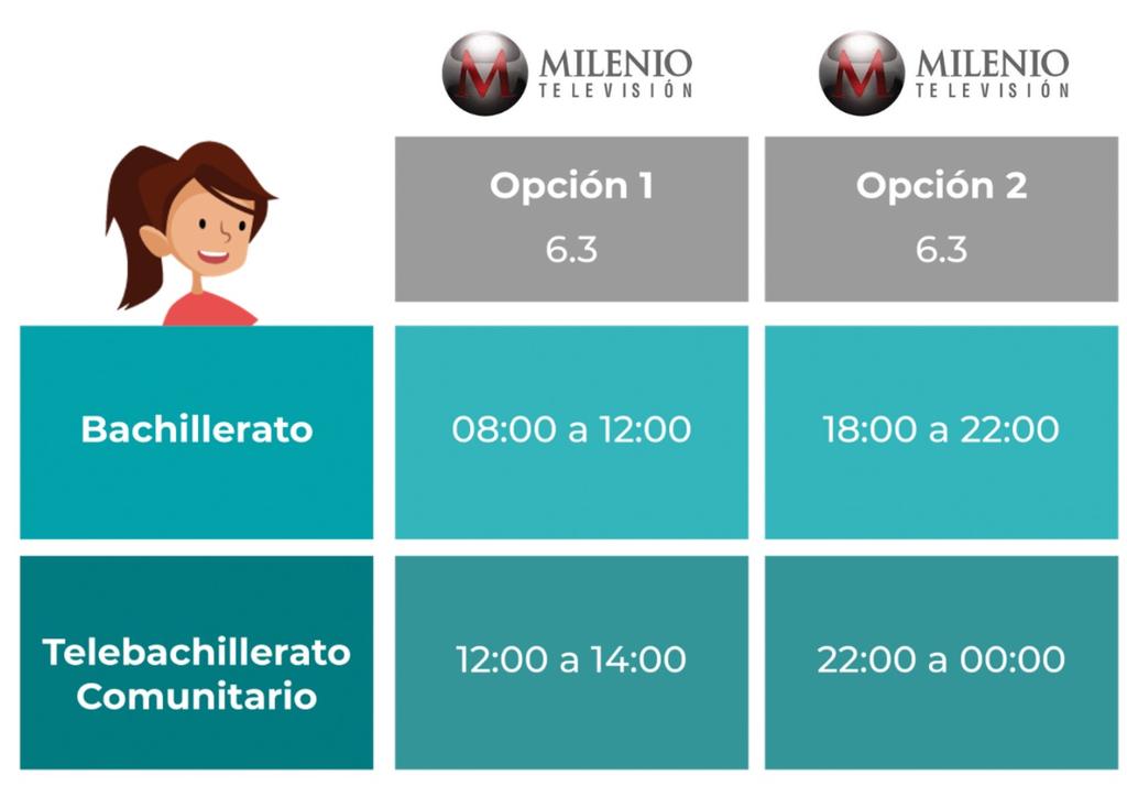 Para los alumnos de bachillerato, las materias se darán por Ingenio TV (canal 14) y Milenio Televisión (canal 6), y abarcarán de 8 de la mañana a 12 del mediodía con una repetición de 8 de la noche a 12 de la media noche.