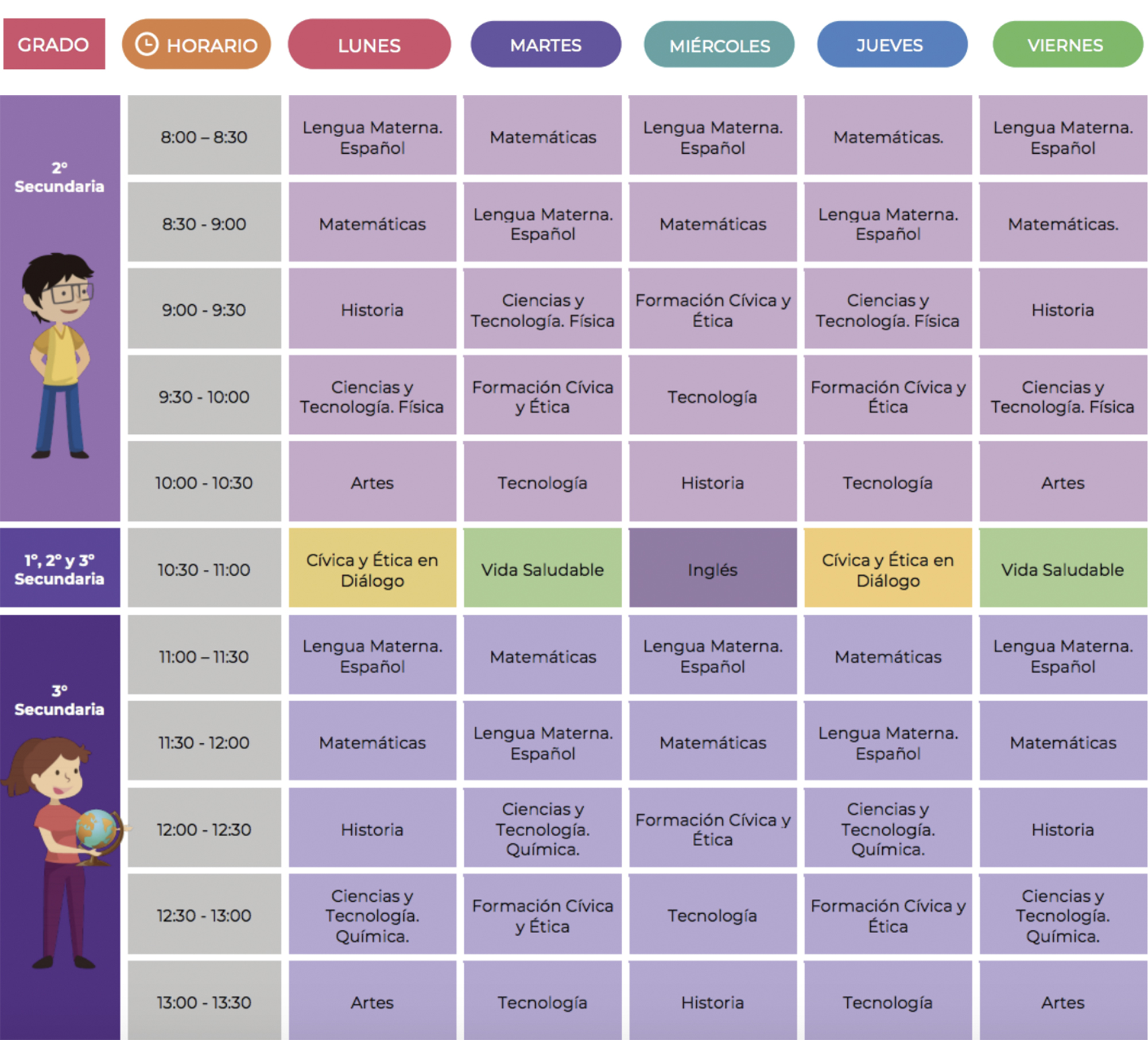 Similar a lo que ocurre con los grados de primaria, en el nivel secundaria los estudiantes compartirán media hora diaria para las materias de inglés, Vida Saludable, y Cívica y Ética en Diálogo.