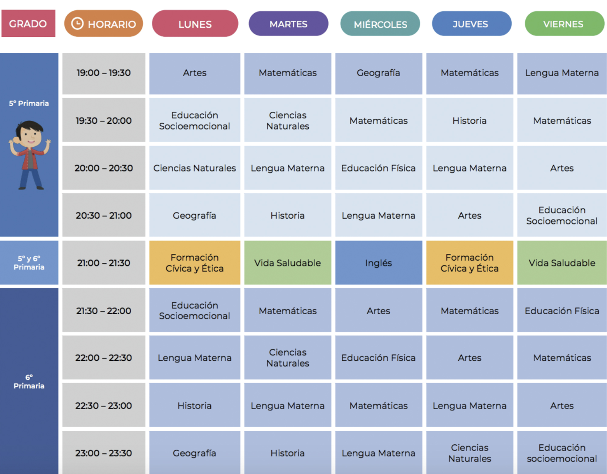 Para los niños que tomen su clase de 8 a 9 de la mañana, éstas se verán través del canal Once niños (11) o Televisa (canal 5). En el caso de los alumnos tomen clases de 3 a 4 de la tarde, deberán sintonizar Imagen Televisión (canal 3) y finalmente, quienes tengan clases de 5:30 a 6:30 de la tarde podrán tomar las materias a través del canal 1o (sólo en la CDMX).