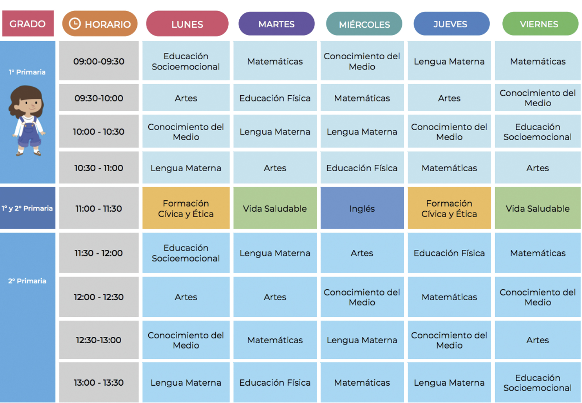 En cuanto a las materias, es importante aclarar que cada par de grados escolares (primero y segundo, tercero y cuarto, quinto y sexto) compartirán media hora diaria para las materias de Inglés, Vida Saludable, y Formación Cívica y Ética.