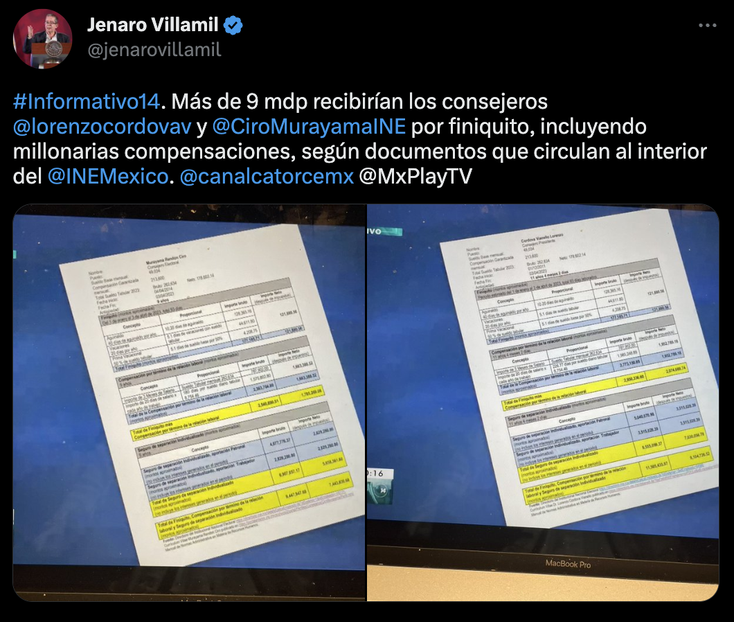 Jenaro Villamil mencionó hace algunas semanas que —según sus cálculos y algunas presuntas filtraciones— el finiquito de Lorenzo Córdova sería superior a los 9 millones de pesos. El finiquito de otros consejeros sería mayor a los 7 millones 500 mil pesos.