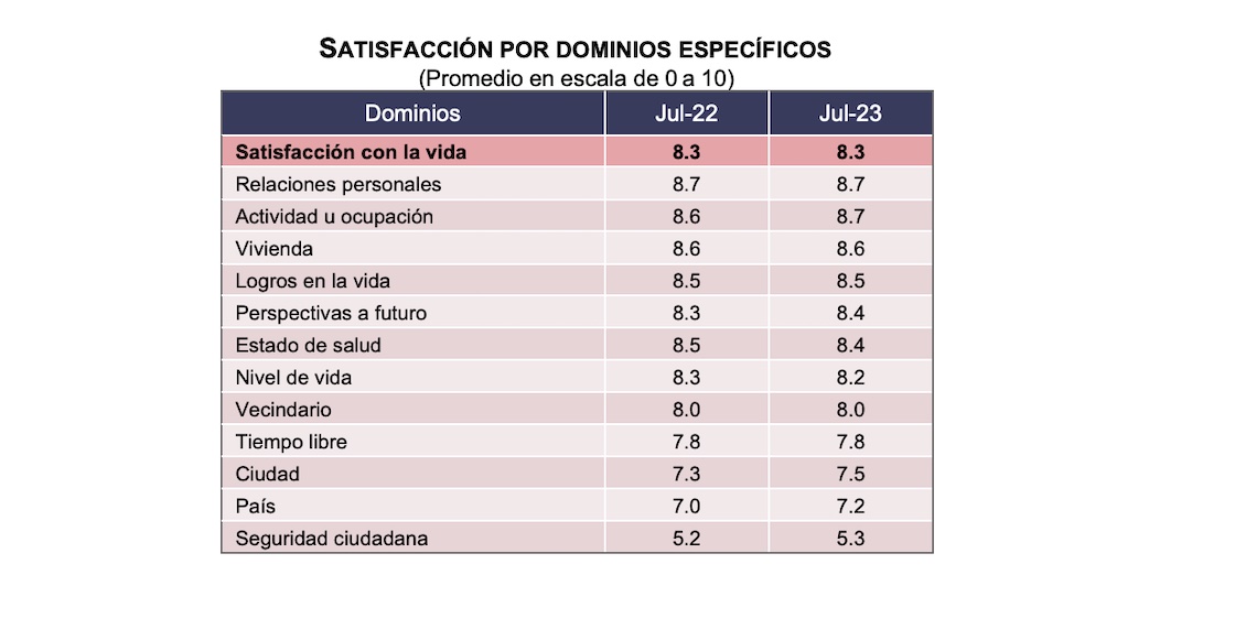 Las calificaciones más bajas se las llevaron seguridad ciudadana —con un 5.3—, las condiciones del país, la ciudad y… el tiempo libre que se llevó una calificación de 7.8.