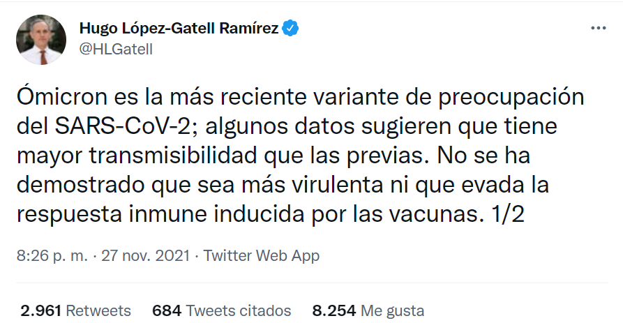 “Ómicron es la más reciente variante de preocupación del SARS-CoV-2; algunos datos sugieren que tiene mayor transmisibilidad que las previas. No se ha demostrado que sea más virulenta ni que evada la respuesta inmune inducida por las vacunas“, puso el subsecretario en su Twitter.