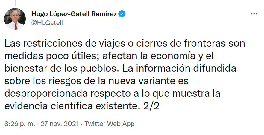 “Las restricciones de viajes o cierres de fronteras son medidas poco útiles; afectan la economía y el bienestar de los pueblos. La información difundida sobre los riesgos de la nueva variante es desproporcionada respecto a lo que muestra la evidencia científica existente”, finalizó su mensaje. ¿Apoco no suena a lo mismo que dijo en marzo del 2020?
