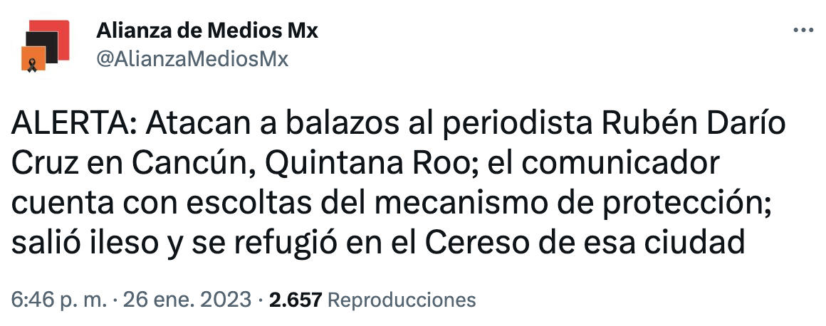 De acuerdo con los reportes que se han publicado hasta el momento en redes sociales, el periodista Rubén Darío Cruz fue atacado a balazos en Cancún, Quintana Roo.