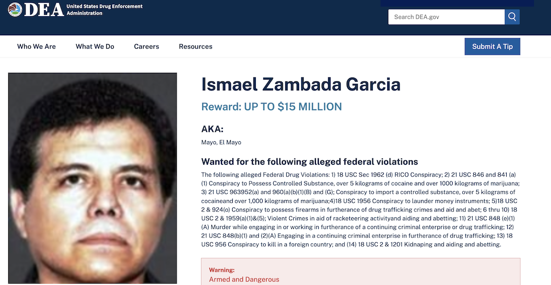 Aunque Ismael El Mayo Zambada había salido desde mediados de 2023 de la lista de los 10 criminales más buscados en Estados Unidos, su caso no era menor. La DEA ofrecía hasta 15 millones de dólares por su captura.