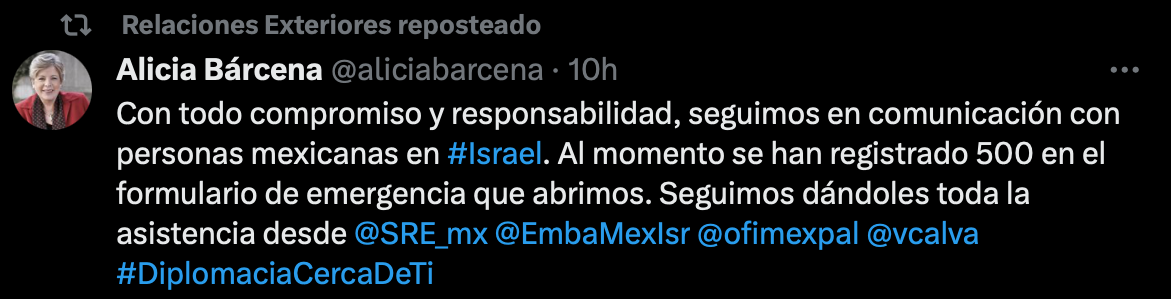 “Para más información sigan nuestras redes sociales, en donde estamos brindando actualizaciones oficiales y seguras”, señala la cancillería en el mensaje difundido en su cuenta X.