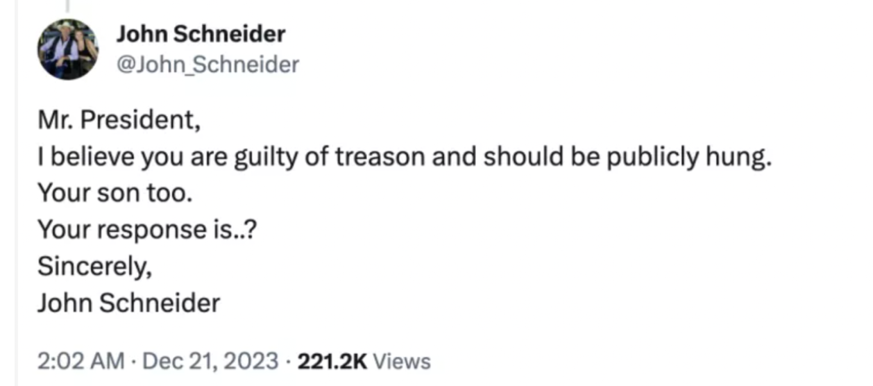 El llamado a ejecutar a Joe Biden fue borrado de inmediato por John Schneider, sin embargo, en un alarde de que nada se le escapa al Servicio Secreto de los Estados Unidos (ni a los internautas), claaaaaro que hay pantallazo de la amenaza.