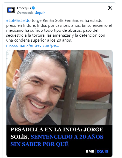 Jorge Renán Solís Fernández es un mexicano que lleva detenido en la India desde 2018, y a finales de este mes podría recibir sentencia. Su familia acusa que fue detenido en medio de violaciones a sus Derechos Humanos y sin ser culpable de nada.