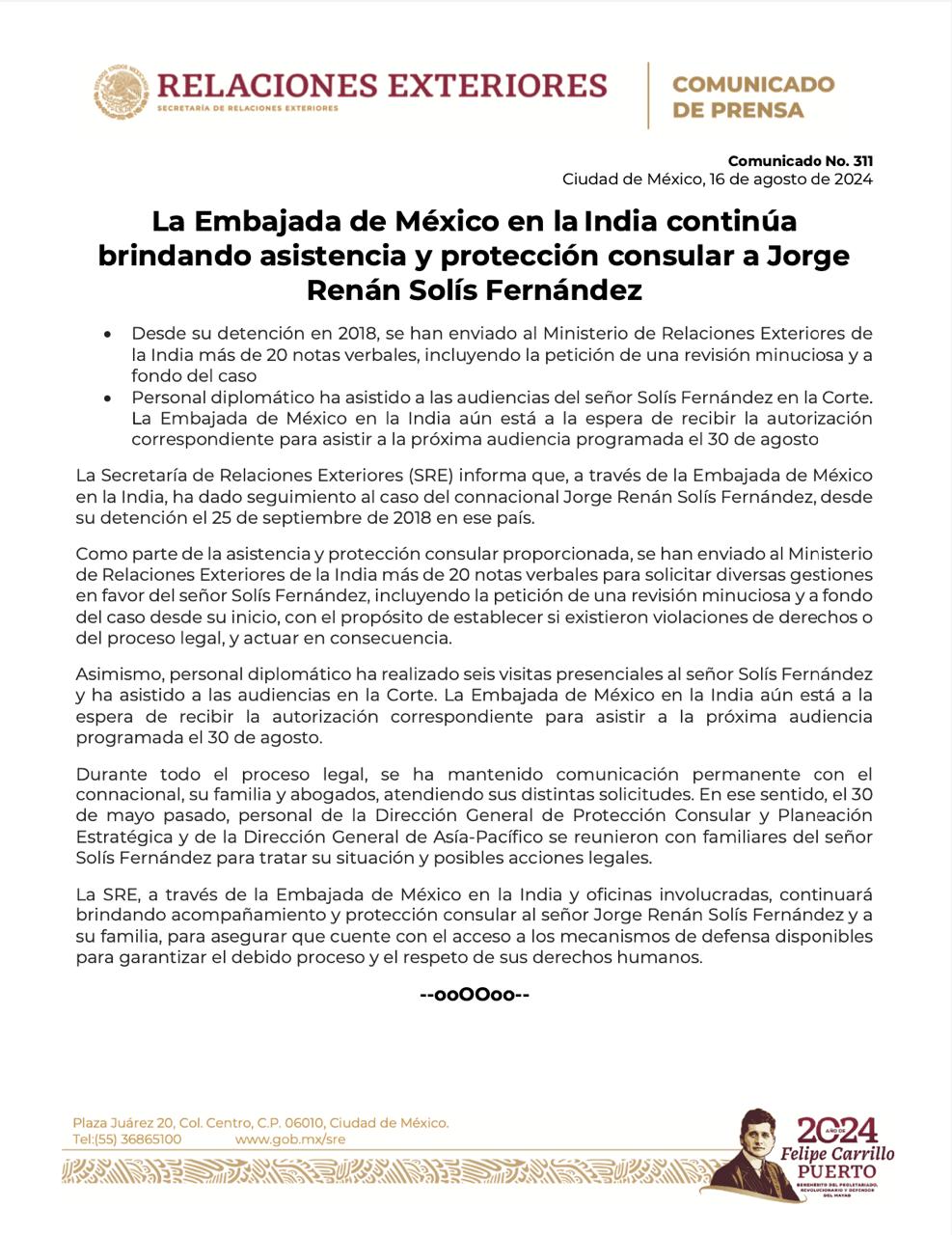 “La SRE, a través de la Embajada de México en la India y oficinas involucradas, continuará brindando acompañamiento y protección consular al señor Jorge Renán Solís Fernández y a su familia, para asegurar que cuente con el acceso a los mecanismos de defensa disponibles para garantizar el debido proceso y el respeto de sus derechos humanos”.