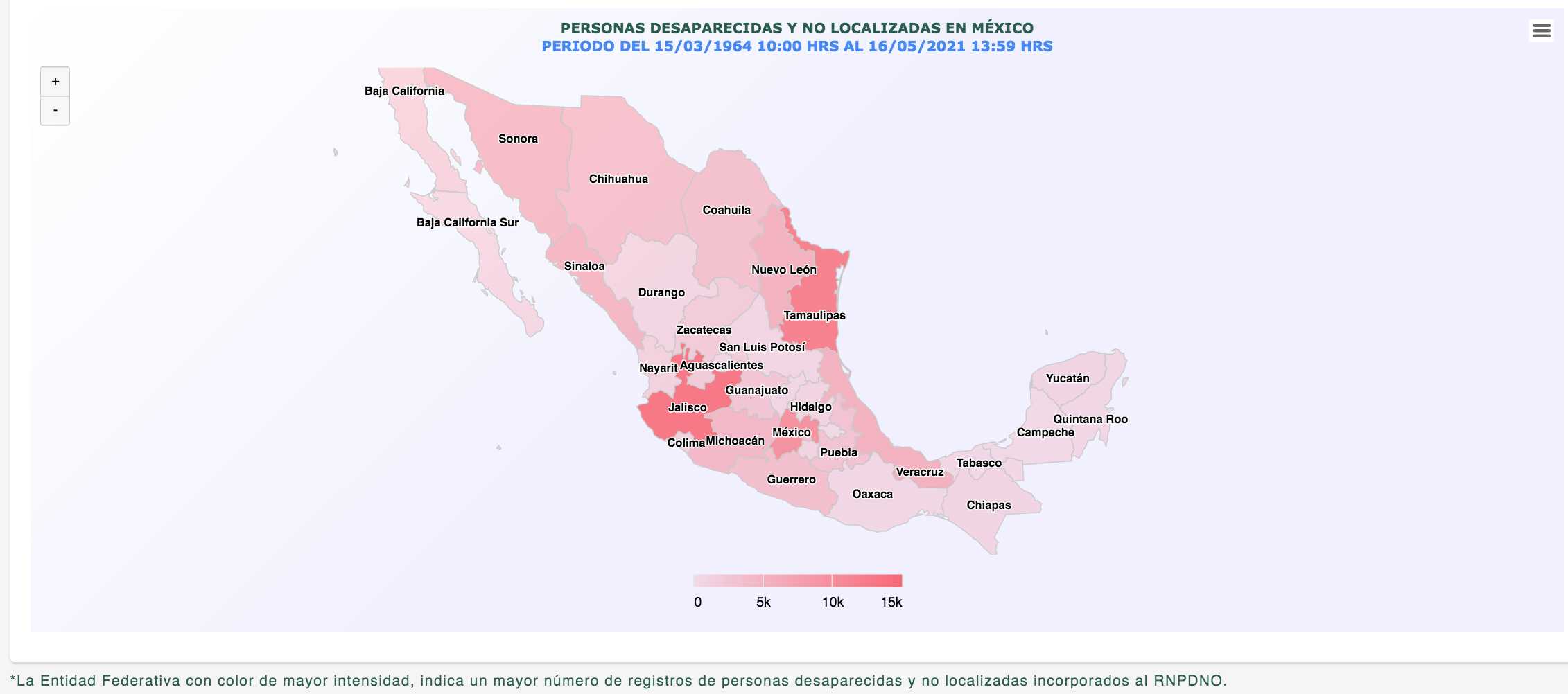 Datos de la RNPDNO ubican a Jalisco como uno de los estados de la república con un mayor número de registros de personas desaparecidas y no localizadas, al igual que Tamaulipas y el Estado de México que son las entidades con color rojo más intenso que el resto del país.