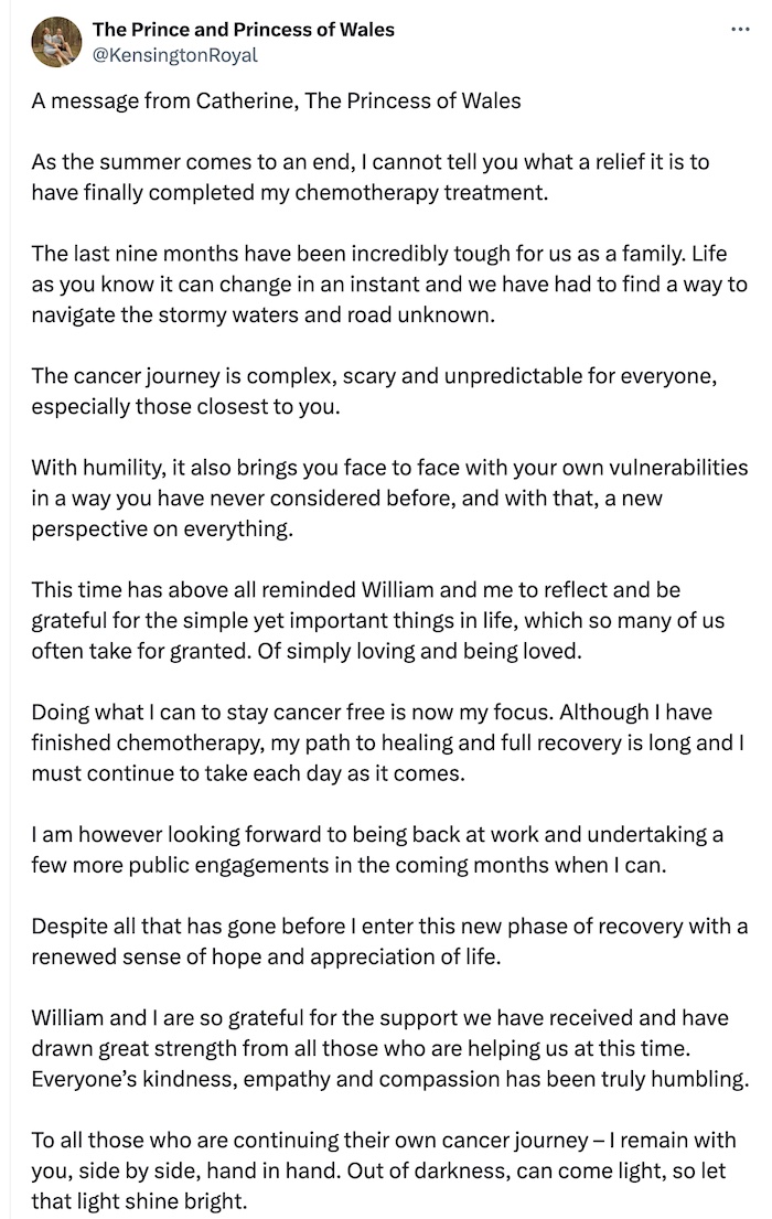 Cinco meses después de que la propia Kate Middleton compartiera con toda la comunidad de Reino Unido que padecía cáncer —en medio de una ola de teorías de la conspiración que surgieron, en parte, debido al hermetismo del equipo de Comunicación de la familia real—, la princesa de Gales compartió que terminó con la quimioterapia.