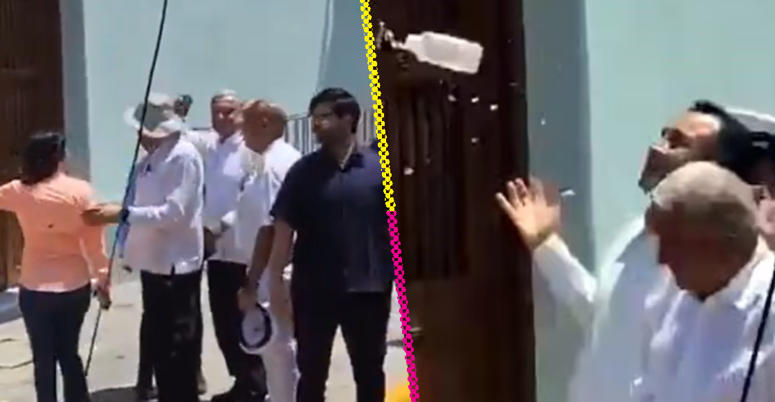Y es que los no fans de AMLO decidieron dar a conocer sus sentimientos al respecto al comenzar a gritarle “dictador”. Pero la cosa se puso peor cuando una persona le lanzó una botella de agua al presidente, quien logró esquivar el golpe.