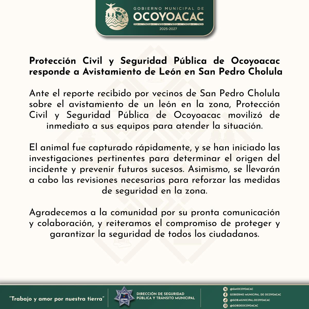 Seguramente se están preguntando lo mismo que nosotros ¿De dónde salió un león en Ocoyoacac? Pues hasta el momento no se sabe, el comunicado del Gobierno Municipal no dio detalles y solo aseguró que se van a ‘reforzar las medidas de seguridad de la zona’.