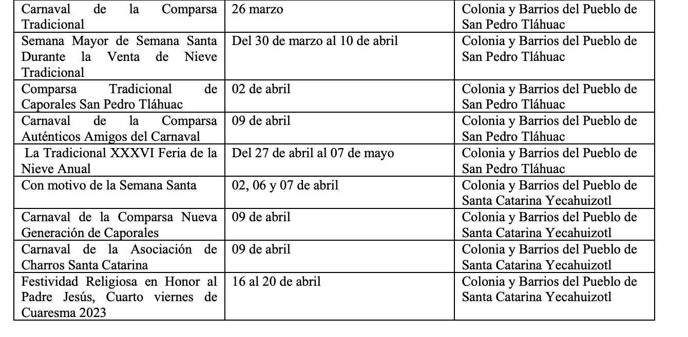 Las celebraciones de carnaval se van a llevar a cabo en distintas fechas de lo que queda de marzo y abril en San Juan Ixtayopan, San Francisco Tlaltenco, Zapotitlán, San Pedro Tláhuac y Santa Catarina Yecahuizotl.