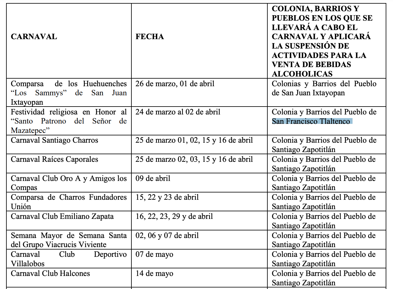 Este 23 de marzo la alcaldía Tláhuac, de la Ciudad de México, publicó un aviso en la gaceta oficial capitalina para anunciar la aplicación de la ley seca en todos los comercios dentro de los barrios y colonias que tendrán carvanales.