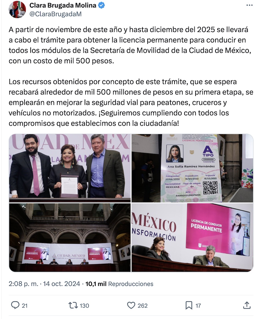 Entonces, a partir de noviembre de 2024 y hasta diciembre de 2025 los chilangos y las chilangas podrán tramitar su licencia permanente de conducir.