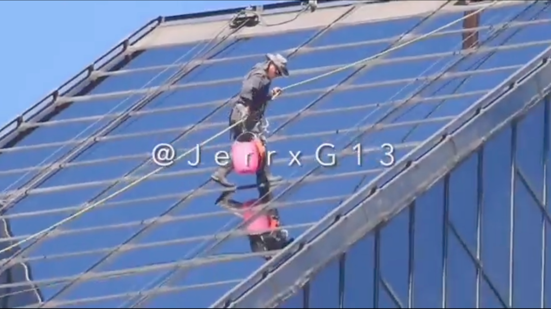 Y sí, la principal razón por la que este video se viralizó es porque en él se puede observar como un limpiador de vidrios solo se sujeta con una cuerda para no caer al vacío, a la vez que también carga una cubeta con el jabón y otras herramientas para cumplir con su valiente chamba.
