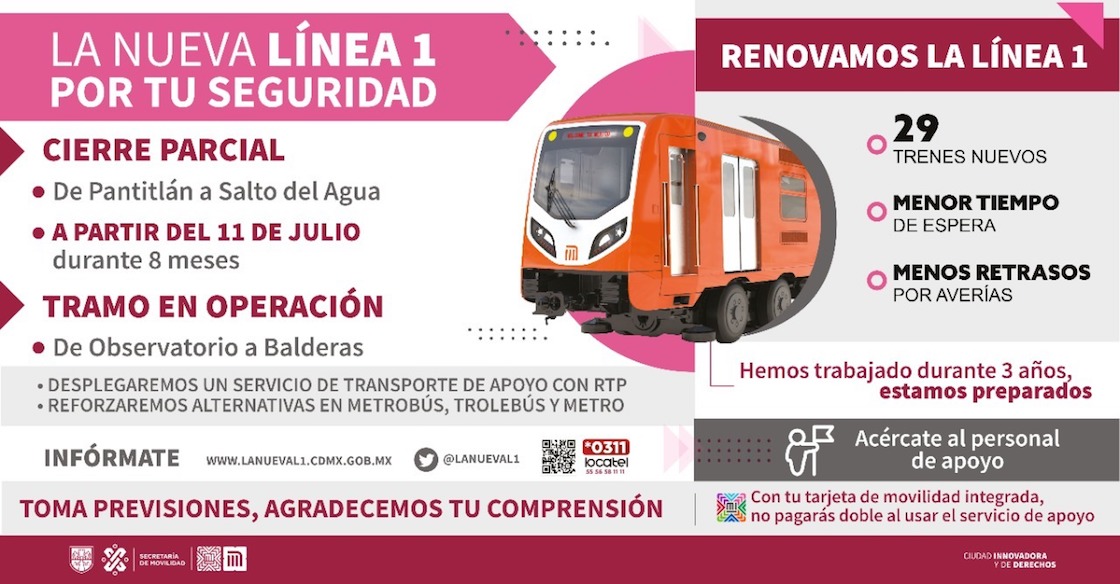 La Línea 1 estará cerrada por tramos y el cierre comenzará en julio de 2022 con el tramo de Pantitlán a Salto del Agua —el lunes 11 de julio. De ahí se moverán a Balderas a Observatorio con un trabajo aproximado poco más de un año.