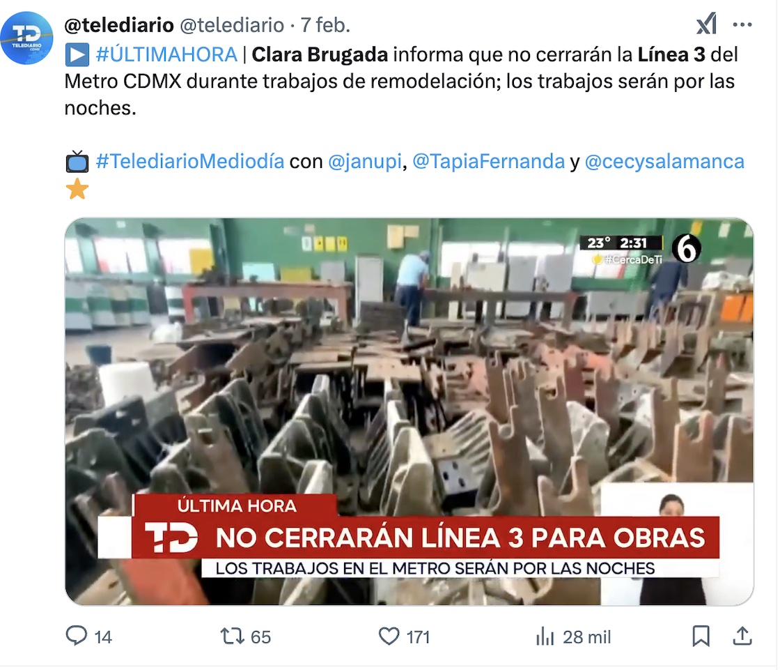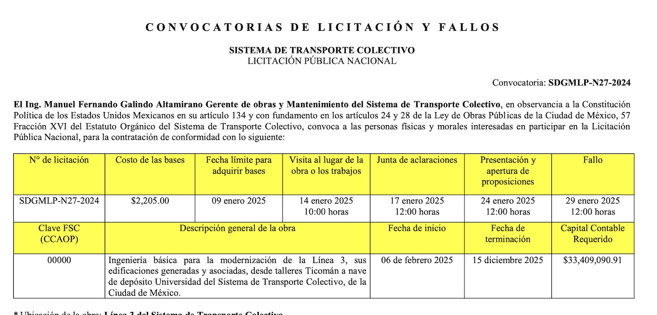 Por cierto, en la Gaceta Oficial el gobierno de CDMX ya había publicado la licitación de la modernización de la Línea 3, donde indicaba que todo el asunto arrancaría a partir del 6 de febrero. Aunque Clara Brugada explicó que apenas están en los estudios técnicos.