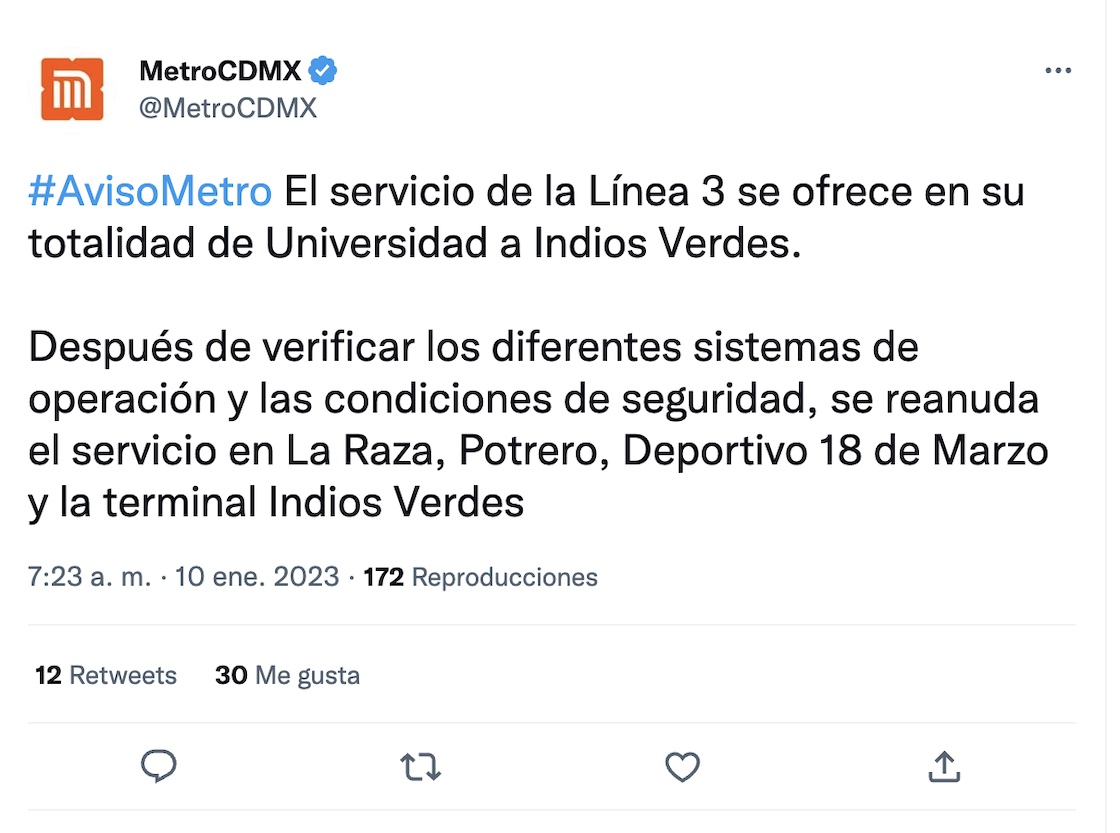 “El servicio de la Línea 3 se ofrece en su totalidad de Universidad a Indios Verdes. Después de verificar los diferentes sistemas de operación y las condiciones de seguridad, se reanuda el servicio en La Raza, Potrero, Deportivo 18 de Marzo y la terminal Indios Verdes”.