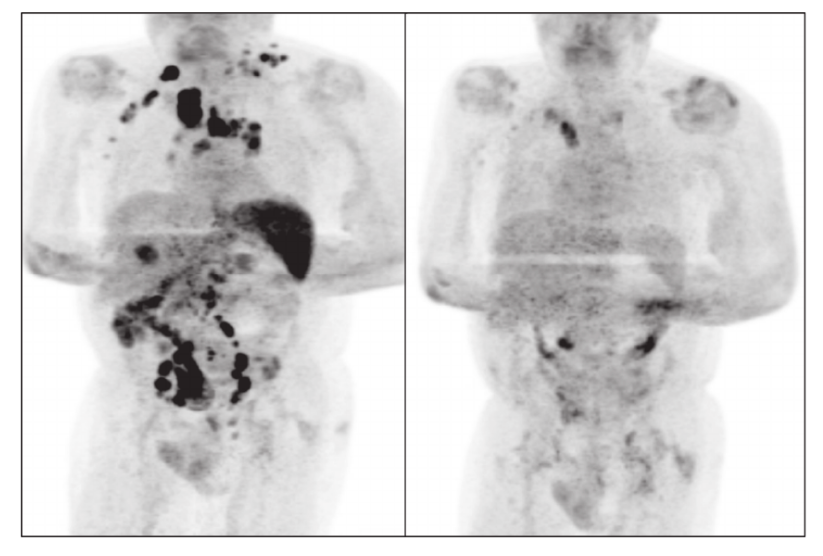 Sorpresivamente cuatro meses después, cuando le tocaba una revisión por el padecimiento de linfoma, los médicos notaron que la inflamación de los ganglios había reducido considerablemente y gracias a una exploración PET, una tomografía por emisión de positrones, se dieron cuenta que había una remisión generalizada del linfoma.
