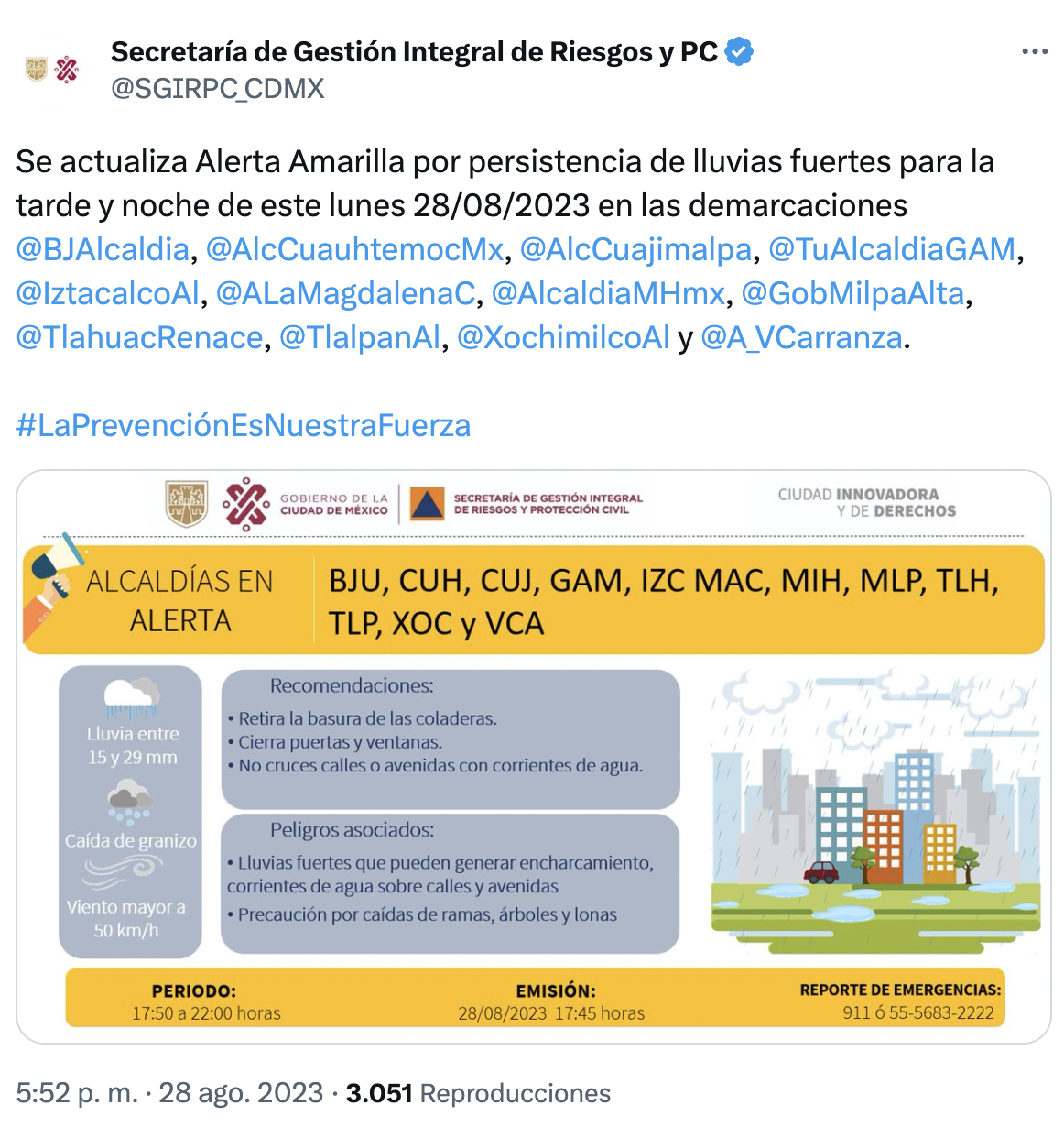 Por medio de sus redes sociales, la Secretaría de Gestión Integral de Riesgos y Protección Civil anunció la activación de la alerta amarilla para las alcaldías Benito Juárez, Cuauhtémoc, Cuajimalpa, Gustavo A. Madero, Iztacalco, Magdalena Contreras, Miguel Hidalgo, Milpa Alta, Tláhuac, Tlalpan, Xochimilco y Venustiano Carranza.