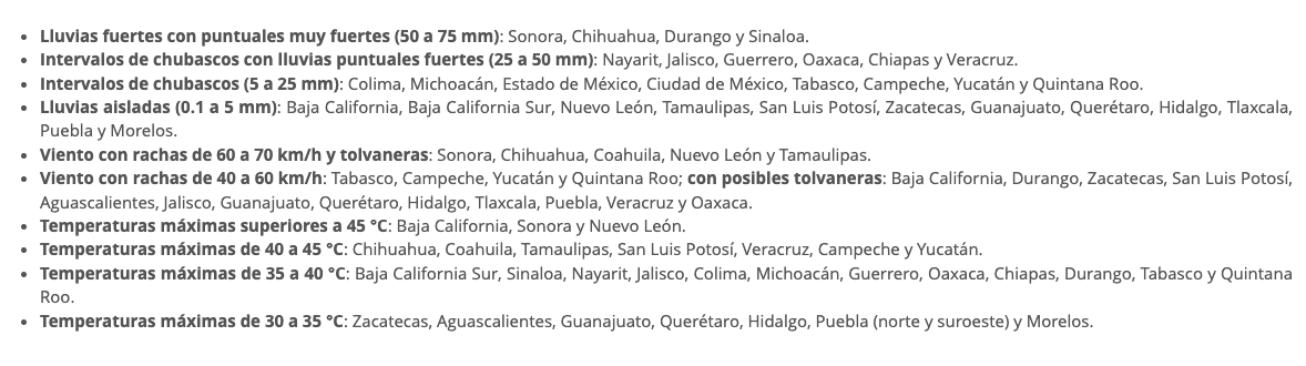 Por medio de un comunicado, la Comisión Nacional del Agua (Conagua) explica que el monzón mexicano originará lluvias fuertes, descargas eléctricas, rachas de viento y posibles granizadas para estados como: