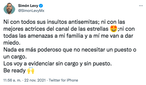 Por todo esto ya existe una denuncia. La denuncia fue presentada ante la Fiscalía General de Justicia de la Ciudad de México por los delitos de amenazas y daños a la propiedad. La víctima afirma que el 15 de noviembre Levy pateó y golpeó su puerta, domicilio ubicado en la colonia Polanco de la alcaldía Miguel Hidalgo.