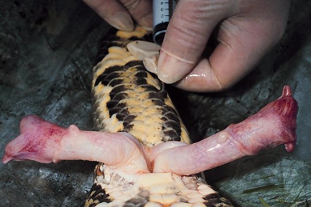 No sé si están enterados de lo que es un hemipene, pero estoy seguro de que no lo quieren saber. Se trata del pene doble que tienen las serpientes y los lagartos. Es doble para alternar entre hembras y no cansarse, aparentemente. La forma de estos hemipenes es bastante alocada, como peinado funky. Adicionalmente, cuenta con unos ganchos para no resbalarse cuando está penetrando a la hembra. ¡Qué bonito animalito!