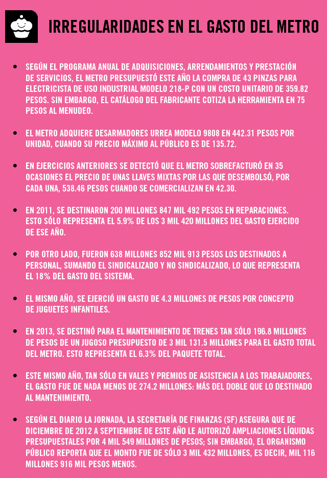 El argumento principal para elevar la tarifa del metro es que el propio sistema no puede ser mejorado con la entrada de dinero que, por un lado, proviene del pago de los usuarios y, por otro, del presupuesto de egresos del Distrito Federal. El sistema, no obstante, no tiene la mejor forma de repartir sus gastos, como lo indican algunos de los datos publicados recientemente por los diarios Reforma y la Jornada.