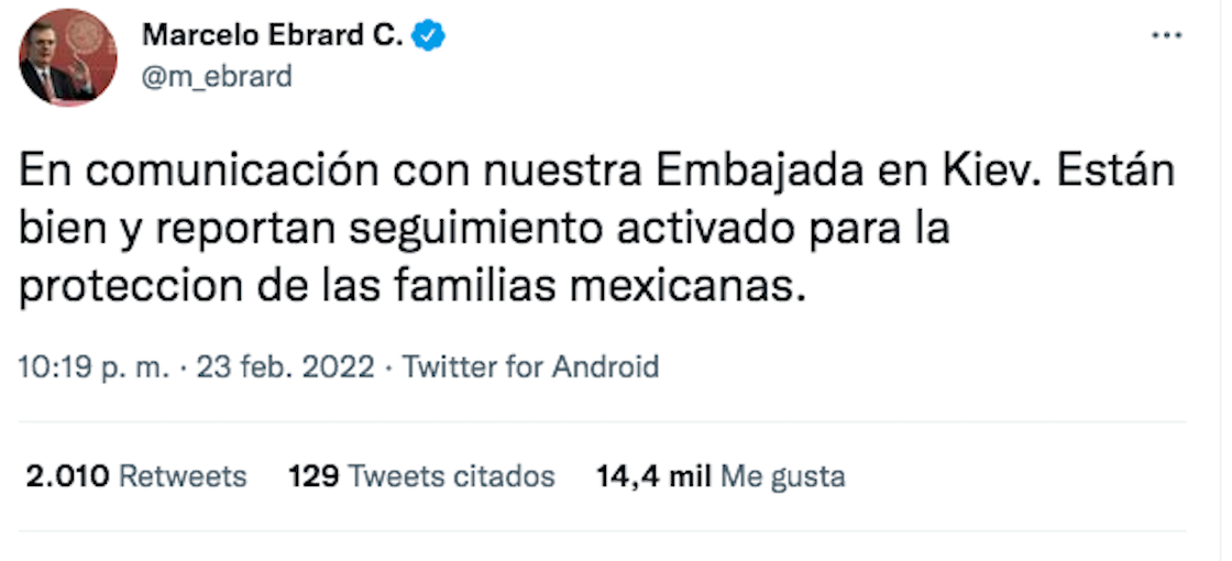O sea, ir por el diálogo y resolver el conflicto por la vía diplomática. Además, Marcelo Ebrard dijo que México no romperá relaciones ni con Rusia ni Ucrania.