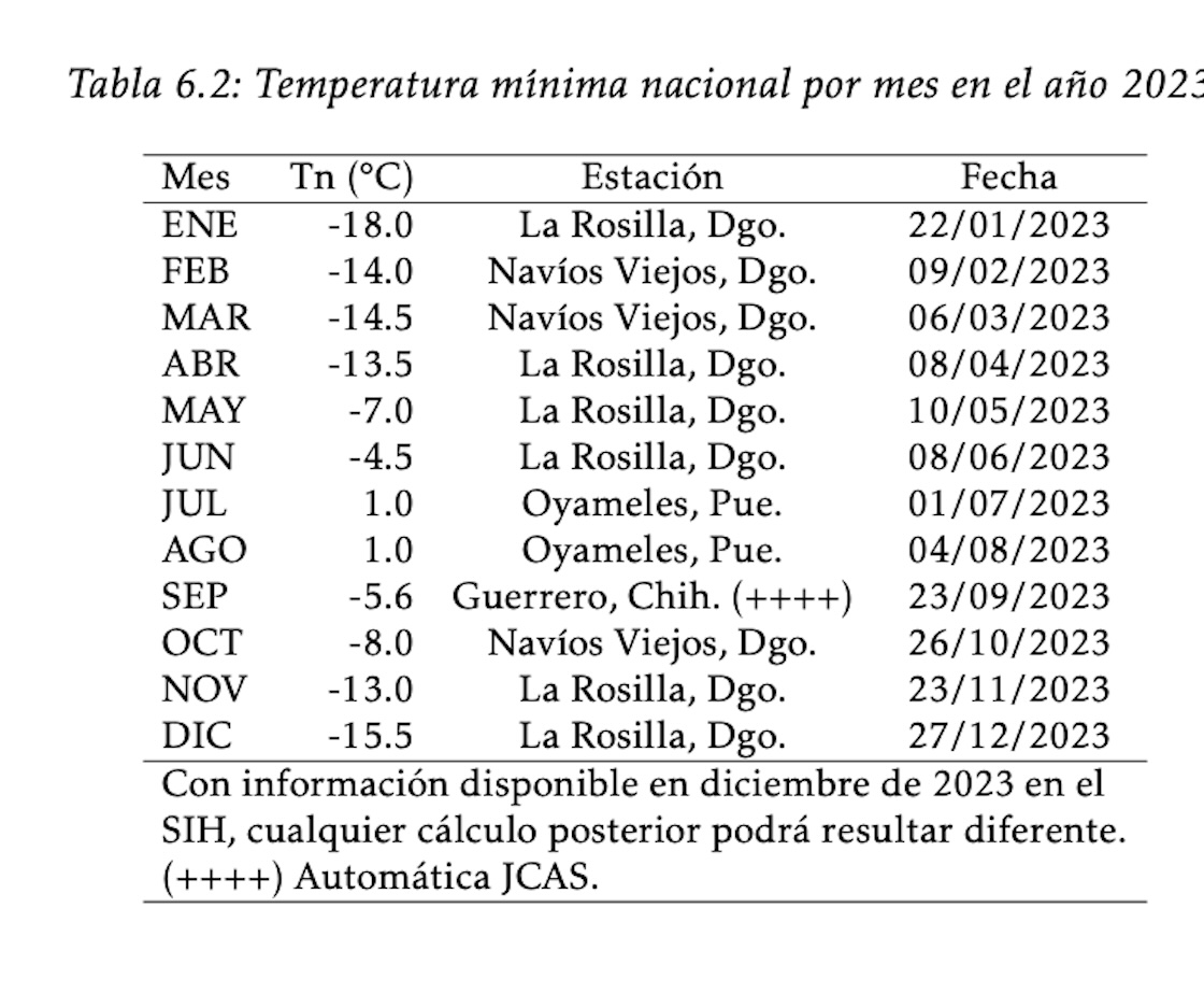 En su lista, el récord de la temperatura mínima nacional por mes en 2023 fue para La Rosilla en Durango.