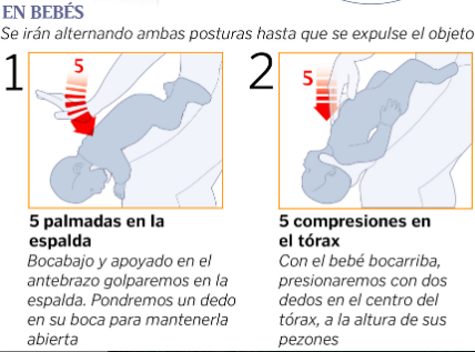 Si el objeto no sale, pon al bebé boca arriba y presiona con dos dedos en el centro del tórax, a la altura de los pezones en 5 ocasiones. Altera estas dos posturas hasta que el objeto sea expulsado.