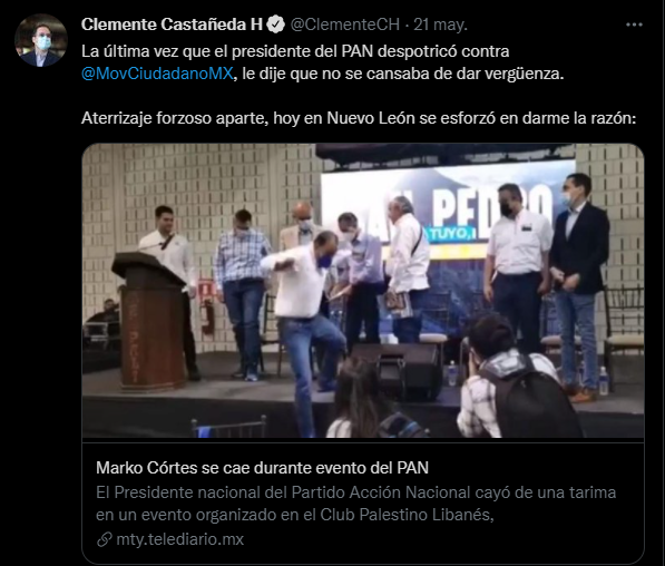 Marko Cortes no salió lesionado ni mucho menos, nomás perdió un poquito de dignidad tras su accidente. Pero como dijimos antes, entre las burlas por su caída se encontró también un mensaje de nada menos que el coordinador Nacional de Movimiento Ciudadano, Clemente Castañeda Hoeflich.