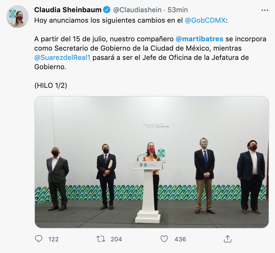 ¡Qué creeeeen! Este lunes 12 de julio, en conferencia de prensa, la jefa de Gobierno de la Ciudad de México anunció algunos cambios en el gabinete, entre ellos, la entrada de Martí Batres, actual senador. A partir del próximo 15 de julio, Batres Guadarrama será Secretario de Gobierno.