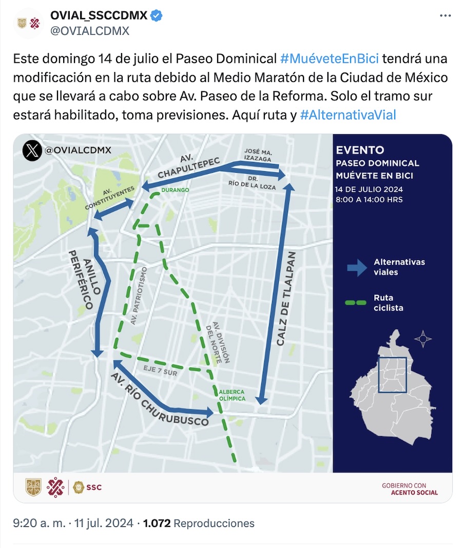 Además de las calles cerradas, el Paseo Dominical en Bici también tendrá cambios por el Medio Maratón de CDMX.