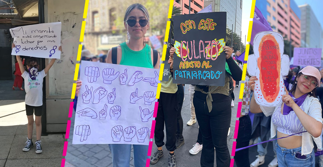 “Estoy criando a un hijo con el que tu hija va a estar segura ¡Te lo prometo!”, “Con este culazo aplasto al patriarcado”, “Esto es pelear como niña”, “Mi mamita me está enseñando a luchar por mis derechos”, y “No hay nada más punk que ser mujer”, son algunas de las leyendas que se pudieron leer en la marcha de este 8M en la CDMX.