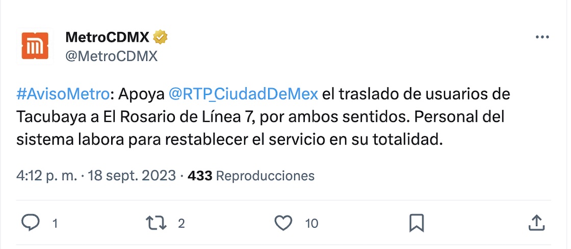 Por lo pronto, lo que sabemos de esta suspensión de servicio en estaciones de la Línea 7 del Metro es que los camiones de la RTP (Red de Transporte de Pasajeros) estarían apoyando en el servicio gratuito de los usuarios de Tacubaya a El Rosario, en las dos direcciones.